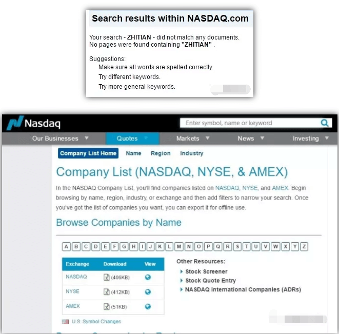 但是,访问纳斯达克官网,搜索“Zhitian”(智天)或"Art Finance"(艺术金融)等关键词,根本搜不到任何信息!!!更不要说上市代码了!