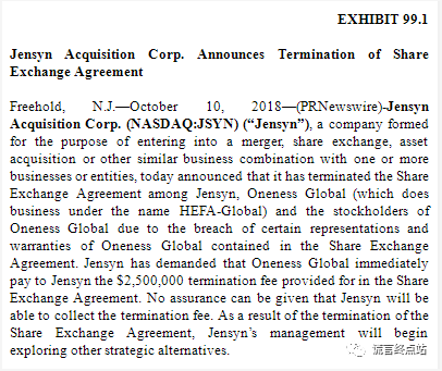 举个例子,去年,合发全球曾高调宣布:通过Jensyn公司SPAC上市,但是,2018年10月10日,Jensyn公司在SEC发布公告,撤销收购协议,并要求合发公司支付250万美元!