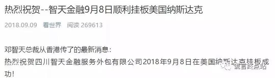 在宣传中,2018年9月8日,智天金融已经在美国纳斯达克成功挂板!
