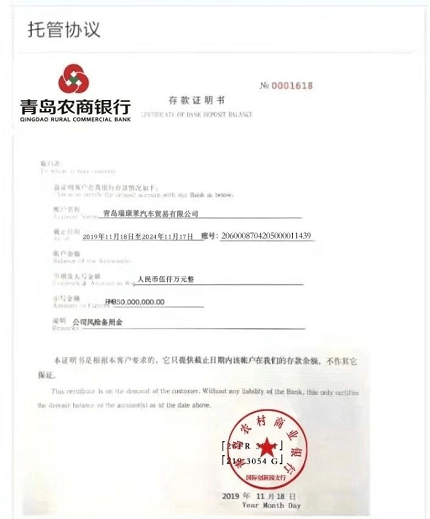 据宣传称:瑞康莱汽车作为国内知名的综合性汽车服务集团公司,打造瑞康莱汽车物权众筹平台,提供包括新车众筹、二手车众筹、平行进口车众筹等在内的项目收益,而公司在青岛农村商业银行存款5000万,作为资金担保。