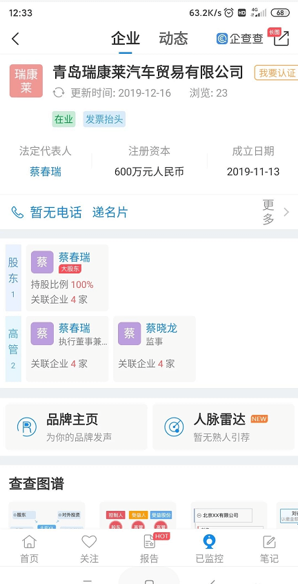 青岛瑞康莱汽车贸易有限公司(以下简称瑞康莱)成立于2019年11月13日,法人蔡春瑞,注册资本600万元,实缴0元。