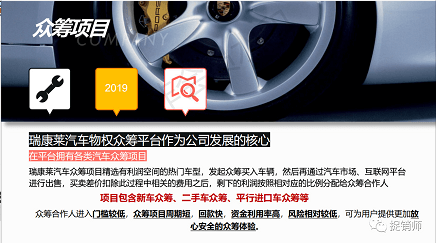 据瑞康莱宣传称,在公司汽车销售、汽车商城、汽车金融等业务支撑下,众筹项目将得到稳健发展。
