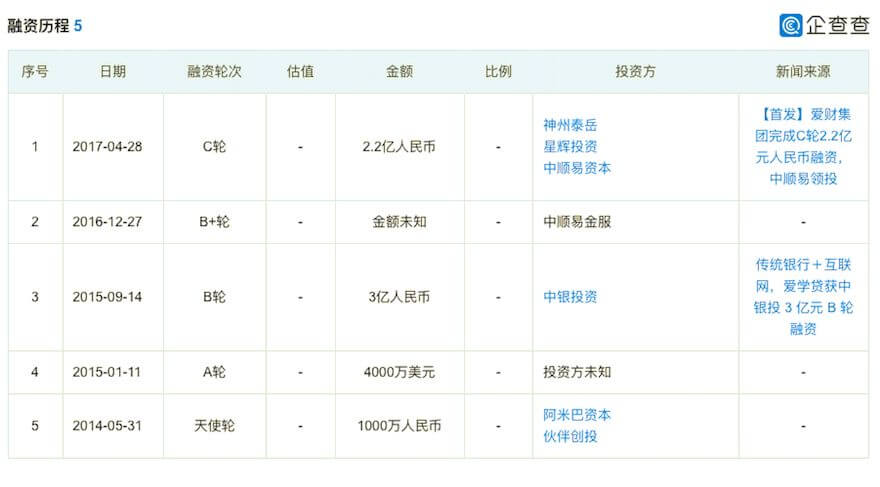 截至2018年,爱财集团共计获得4轮累计近10亿人民币融资,估值超过10亿美金,进入新金融独角兽阵营。最近一次融资发生于2017年4月,爱财集团宣布完成2.2亿元C轮融资,由中顺易领投, 星辉互动和A轮投资方神州泰岳跟投。