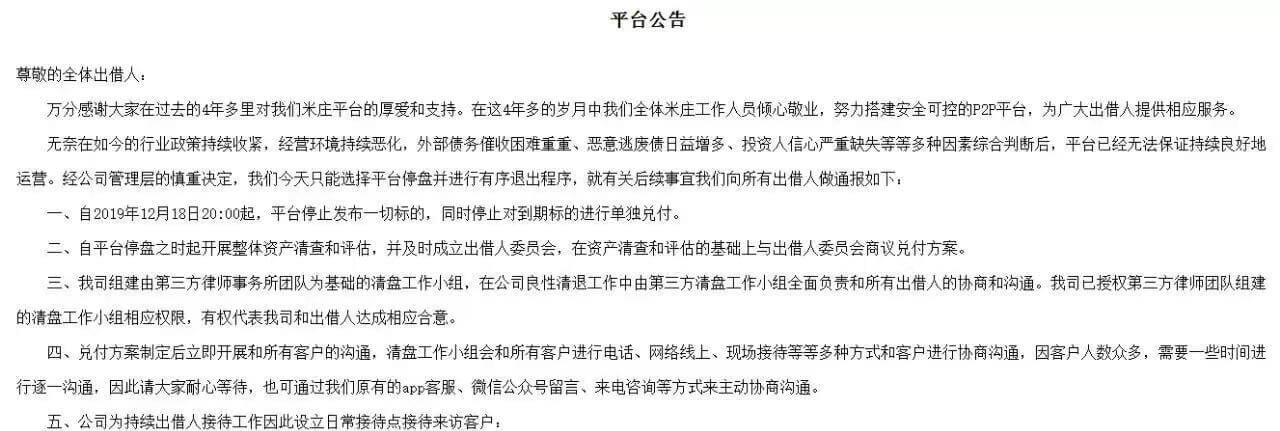 12月8日,杭州互金平台爱财旗下P2P平台米庄理财发布公告,称平台无法保证持续良好运营,决定停盘并进行良性有序退出。还承诺,公司股东、高管,在清盘过程中不跑路、不失联,积极努力进行债务催收,尽最大努力减少出借人损失。