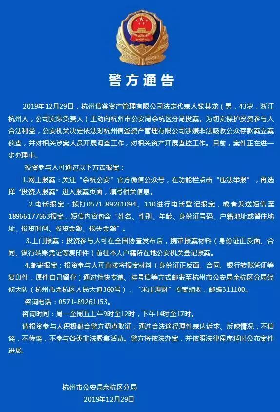 12月29日晚,杭州市公安局余杭区分局发布通告,杭州信釜资产管理有限公司法定代表人钱某龙主动向杭州市公安局余杭区分局投案。公安机关依法对杭州信釜资产管理有限公司涉嫌非法吸收公众存款案立案侦查。