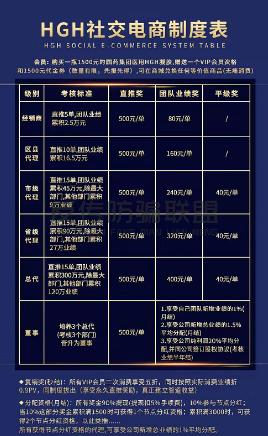 据“国药集团HGH社交电商制度”显示,参与这项目的代理共分为6个级别,分别是经销商、区代、市代、省代、总代和董事。