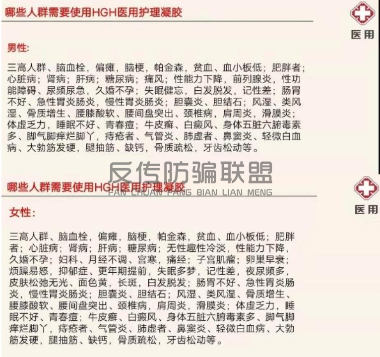 除了以上各种疾病之外,据“国药HGH生长因子抗衰凝胶”微信公众号宣称,“国药HGH医用凝胶”是由广州中医药大学PI团队研发、国药集团药业股份有限公司生产的,拥有“可以使身体的每一个器官都重新生长一次”、“增强机体的免疫力”、“增强性功能及促进性欲,推迟更年期,延缓衰老,年轻10到20岁”、“增强及恢复记忆力,改善睡眠质量,消除疲备感等。