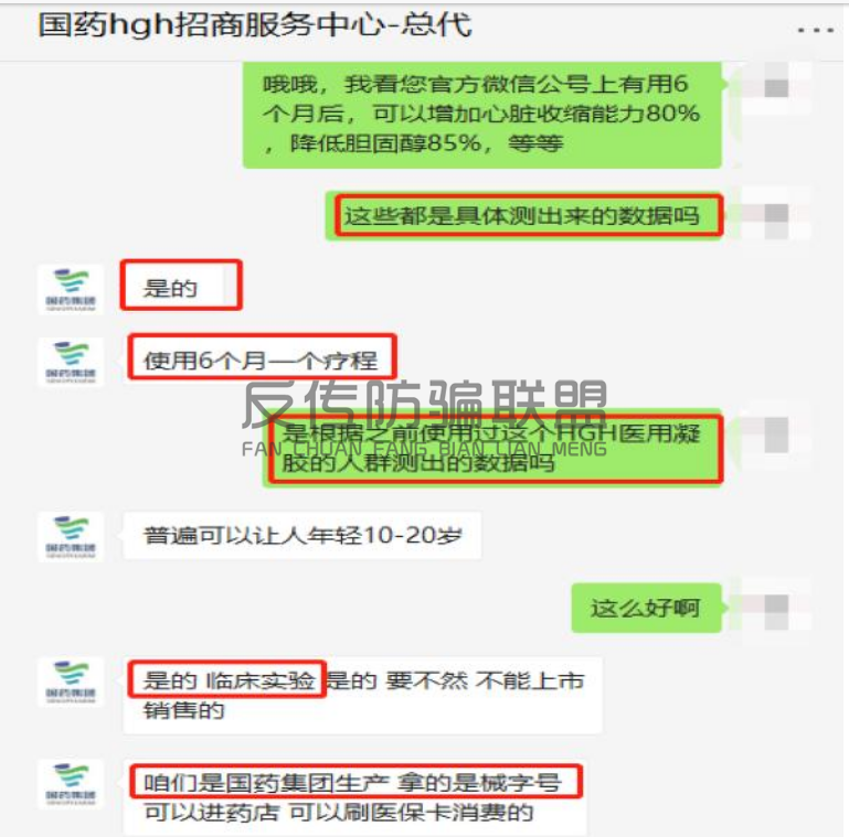 本网在“国药集团黑科技HGH招商群”里发现,每天都有代理商在群体发布各种“成功案例”,去年年底,有代理忽然在该群发布消息称,因“有人发动各种渠道攻击、花重金攻击国药集团,最终高层决定,今后不再用国药集团四个字和logo,一律只用‘新新生命HGH’”。