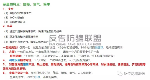 如今的保健品市场混乱不堪,除了三株集团,权健集团,天狮集团等这些有着较大名气的保健品公司不断被“爆雷”之外,目前还有很多类似缔煌这种依旧活跃在百姓生活中的保健品企业。反传防骗联盟在此提醒大家,切勿被帝皇这种“包治百病”的“保健品”以“小投资大回报”的噱头所利诱,最终只能成为其传销模式制度下的牺牲品!