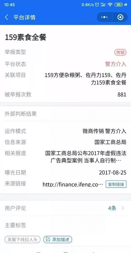 甚至曾有报道称,佐丹力159公司高管已被长春警方全部抓捕。但是记者还未找到确切的信息。不过记者在灵鲲金融风险查询举报中心看到,目前佐丹力159素食全餐处于异常状态,平台状态显示“警方介入”,举报类型为“传销”,被举报次数为877。
