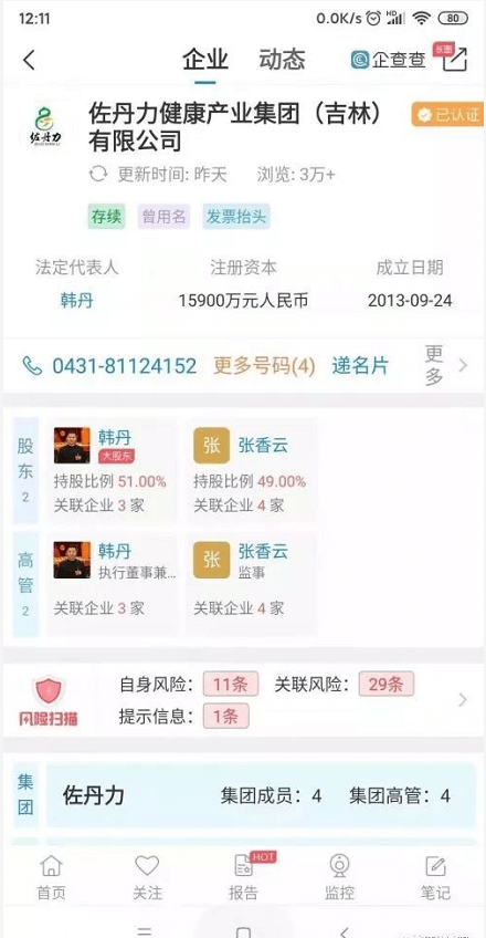 据悉,佐丹力健康产业集团(吉林)有限公司,成立于2013年9月24日,注册资金1.59亿,法人韩丹。旗下拥有子公司——长春广和堂医药科技有限公司,总部坐落于长春市新区北湖科技园。