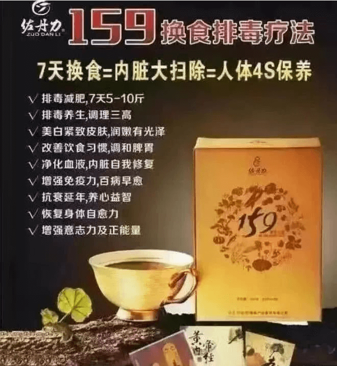 另据调查,“佐丹力159素食全餐”通过微商代理模式获得了近乎疯狂的销量,其广告刷爆各个朋友圈微信群,被不少想要瘦身和追求健康的人士所熟知。就是这么一包五谷杂粮磨成的粉末,打着所谓的纯天然有机,迅速打开市场,更是在宣传资料中除了宣称其的减肥降脂功效,甚至提示能抗癌、调节内分泌等治疗作用,肆无忌惮地声称其具有“通气血、排毒素、补能量、调五脏六腑”的作用,并“对亚健康和瘦身都有明显疗效”,还强调159素食全餐重点恢复“人体的神医”。