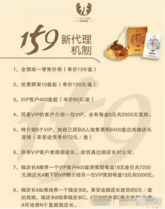 一包五谷杂粮磨成的“固体饮料”,佐丹力159全国统一零售价为159元/盒、优惠顾客单价120元/盒,做VIP代理需要一次性投入3.6万,购进4000盒产品,单价90元/盒,同是VIP的客户介绍一位VIP,会有每盒5元共2000元的奖励,转介绍5个VIP,销售累积8000盒达成微店长资格(享受进货单价72元/盒),微店长A如果培养一个微店长B,享受该微店长进货的10元/盒的奖励,所有VIP客户隶属微店长,进货通过微店长对公司。