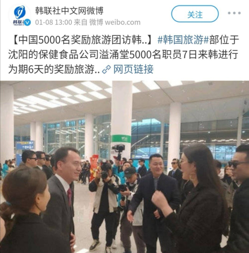近日,据韩联社报道,总部位于沈阳的保健食品公司“溢涌堂”5000名职员7日来韩进行为期6天的奖励旅游。这是2017年以来最大规模的单一企业来韩奖励旅游。