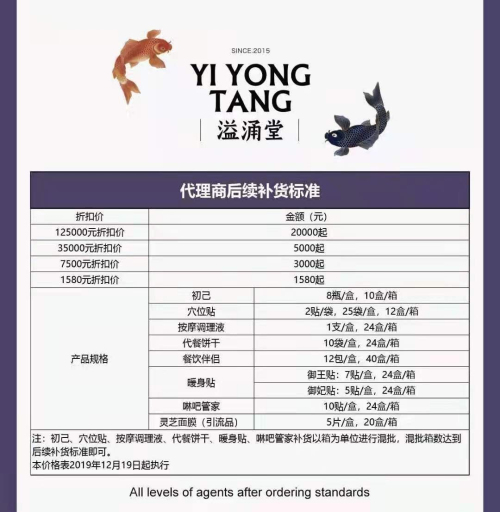 溢涌堂代理李慧向时间财经介绍到,公司代理分为特约代理、二级代理、一级代理、总代理、执行董事和官方6个层级。初次加入,代理商一般推荐的是前三级代理,其中初级代理须首次拿货额达到1580元,此后每次补货1580元起;二级代理首次拿货额须达到7500元,成为二级代理后,每次补货额为3000元;要成为一级代理,则首次所交货款不低于35000元,其后每次补货款的额为5000元;一级代理要想升级到总代,则必须实现一次总额为12.5万元的拿货,其后每次补款额为2万元。