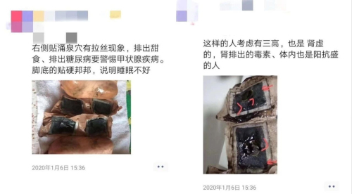 溢涌堂最初的产品为老北京足贴,后改名为老北京穴位贴。上述董事级别代理李慧朋友圈显示,对一张用过的足贴照片评价称,这样的人考虑有三高,也是肾虚、体内阳抗盛的人。对另一张用过的足贴照片评价则称,右侧贴涌泉穴有拉丝现象,要警惕甲状腺疾病,脚底的贴硬邦邦,说明睡眠不好。