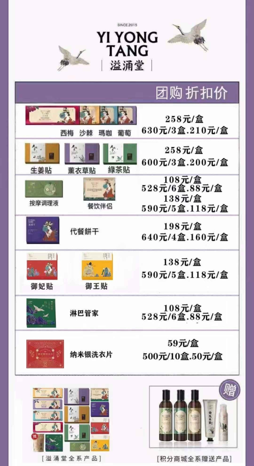 一位级别达到第5级的代理李慧(化名)告诉时间财经,要成为溢涌堂的代理,首先要严格遵循其定价体系,不允许打折降价行为。其给到时间财经的资料显示,溢涌堂老北京穴位贴的团购折扣价位258/盒,3盒优惠价600元,一盒50贴。
