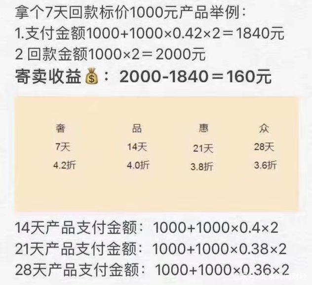 王女士举例称,购买“奢”分类下的一款包包,需要同时购买3个同款包包,其中两个是折扣价。付款之后,奢品惠众会将其中一个快递给王女士,另外两个继续留在奢品惠众上销售。7天的寄售时间一到,奢品惠众会把本金和佣金返还给王女士,王女士可提现出来。王女士赚取的,正是佣金和一个包包。