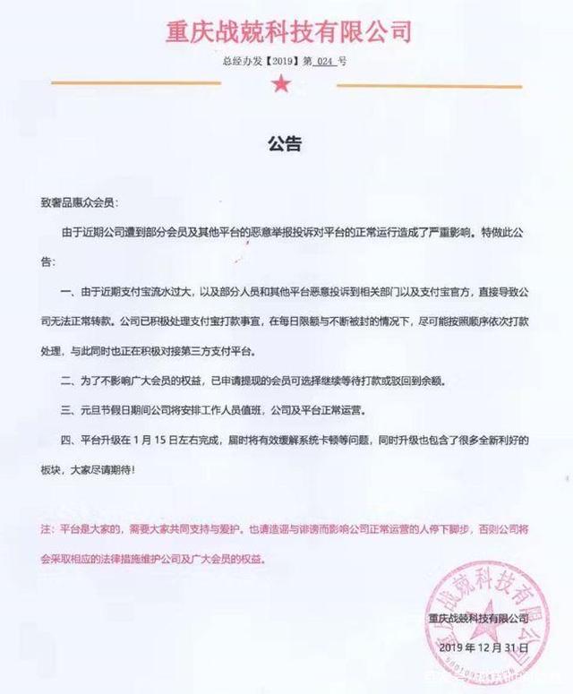 12月31日,奢品惠众发布公告称,由于近期支付宝流水过大,部分人员、其他平台恶意投诉到相关部门以及支付宝官方,直接导致公司无法正常转款。已经申请提现的会员可选择继续等待打款或驳回到余额,平台将会进行升级。