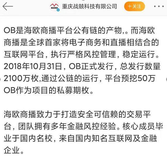 奢品惠众主要负责疑似跑路之后,王女士在调查战兢科技时,发现其公司官方微博显示,在奢品惠众之前,战兢科技还运营了一个叫“海鸥商播”的平台,采用拉人头的制度、以区块链名义推广虚拟货币OB。