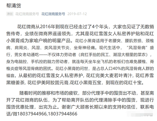 尽管花红微商创造了微商界的“神话”,但是2019年7月12日,花红微商服务号发布题为《帮清货》一文,提出“随着时间的推移和市场的疲软,部分代理手中的囤货出不动,甚至离开了花红微商的队伍,为了帮助离开队伍的代理清除手中的囤货,现进行囤货优惠处理,出完为止。”