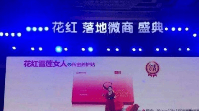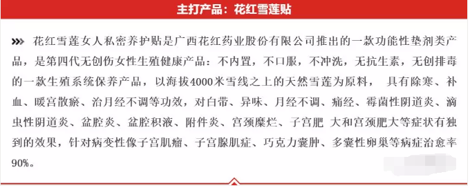 除此之外,花红微商运营的产品还有“花红雪莲贴”,这款由广西花红药业推出的雪莲女人一次性卫生护垫,被宣传为可以调理甚至治疗“宫颈糜烂、子宫肌瘤、囊肿”等隐秘炎症,几乎可以包治妇科百病。但实际上,该款产品的消字号一次性卫生护垫,其卫生许可证号为京卫消证字(2014)第0297号。