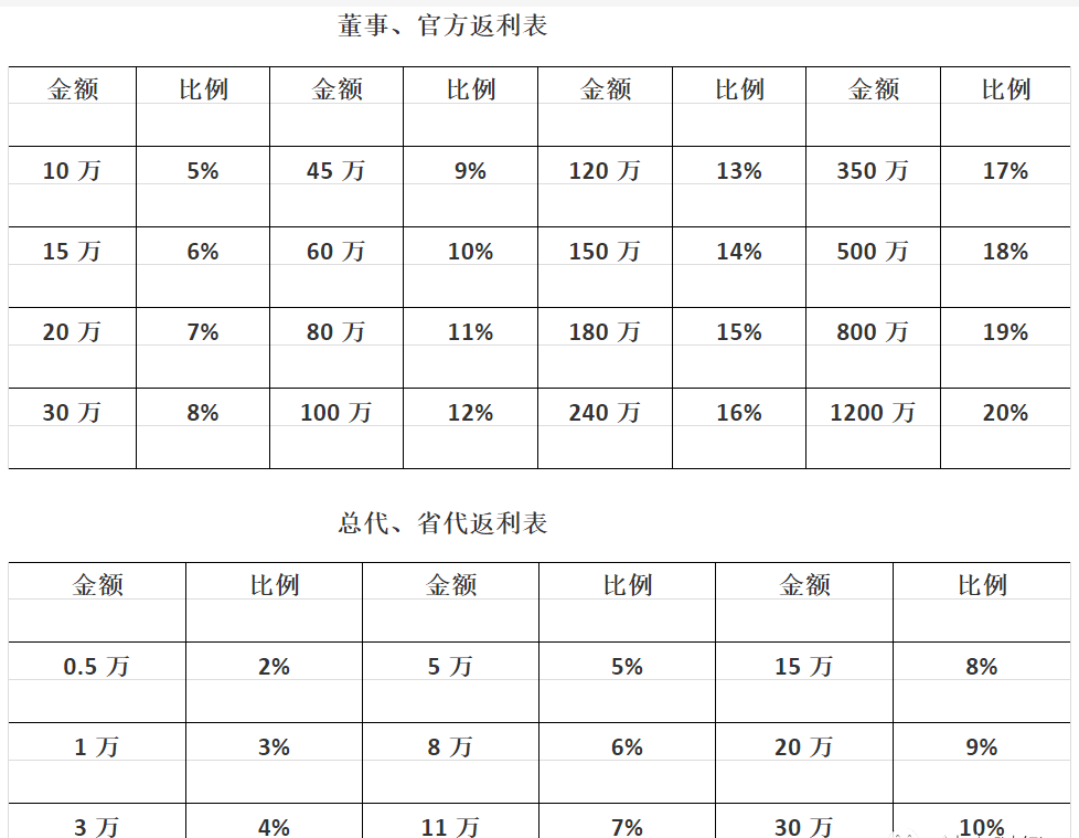 其次,每个月补货业绩返利,同样以花红小黑膏总代总代为例,等产品卖完了需要补货,补货越多返点越高,补货5000元,返点是2%,拿100元;补货10000元,返点是3%,拿300元;补货300000元,返点是10%,拿3万元。最高返点是20%。