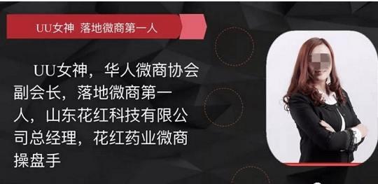 另据了解,花红微商第一人——UU女神(实名黄X超),自称2015年“双11”,带领团队打造一天销售800万元的业绩。三个月时间,打造微商大健康领军品牌。100天时间,让20名董事收入过百万,200多名总代月收入过15万。2016年,成功操盘多款微商大健康产品。这些产品融汇工匠精神、屡获多项国家最高级认证和大奖,共同组成没有淡季的产品线,撬动两千亿市场,引领千亿微商。