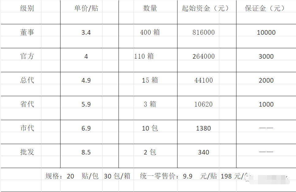 花红微商一共分6个级别,分别是:执行董事、官方、总代、省代、市代、批发。据一位执行董事表示,市代投资1380元,拿到10包共200贴产品,每包的利润是60块钱,卖完这些货的利润是600元;省代投资10620元,拿到3箱货,共90包小黑膏,每包的利润是80元,卖完三箱货的利润是7200元;总代投资44100 元,拿到15箱货,共450包,一包利润是100元,卖完这些货总共利润是44100元;做官方投资264000元,拿到110箱货,共3300包,每包的利润是118元,卖光首批货110箱,利润是389400元;做董事投资816000元,拿到400箱货,共12000包,卖完这些货总共例利润是156万元。