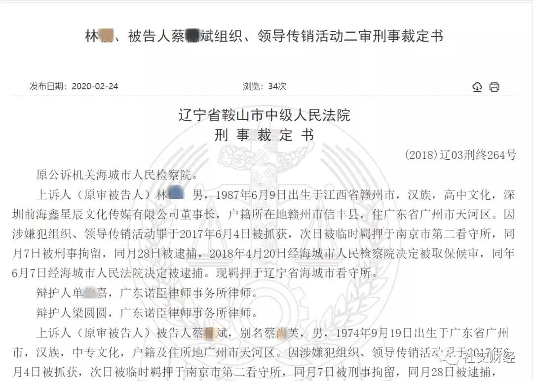 今年2月24日,社交财经在中国裁判文书网发布了《林某、被告人蔡某斌组织、领导传销活动二审刑事裁定书》(以下简称《裁定书》)。