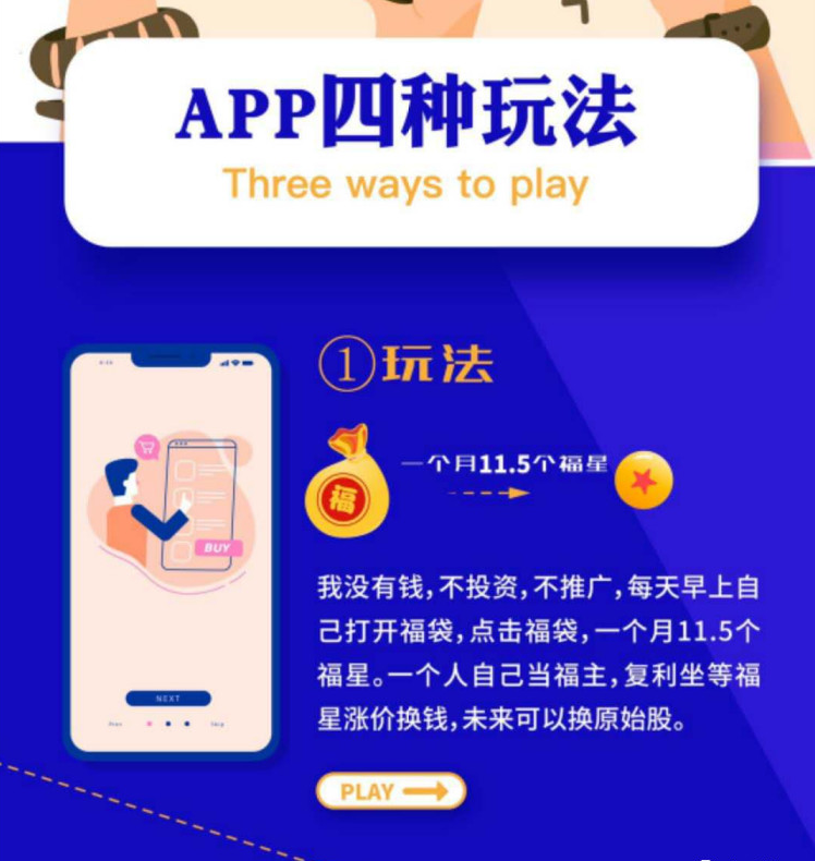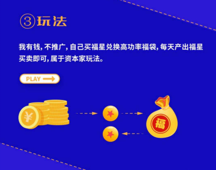 玩法三:做投资不推广,花钱收福星兑换福袋,每天开启福袋月月赚利润。
