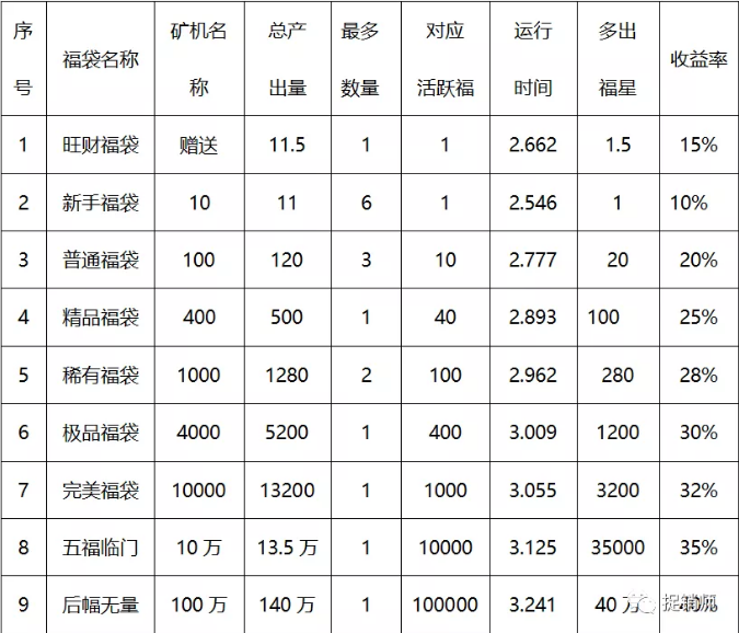 福袋就是“矿机”,相当于母鸡,可以产蛋,蛋可以买卖换钱,也可以兑换:母鸡,福袋也相当于价值多少个“鸡蛋”的价值,按照大小分为9个级别: