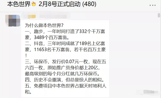 本色世界自称的一年时间打造了332个千万富豪,3489个百万富翁的趣步,其真实情况是这样的:2019年10月15日,从长沙市经开区工商分局获悉,湖南趣步网络科技有限公司(以下简称“趣步”)涉嫌网络传销、非法集资、金融诈骗等违法行为,被立案调查。“环保币”更是在2018年11月即被临川公安局称为传销币、诈骗。抖音成就众多富豪更是无从查证。