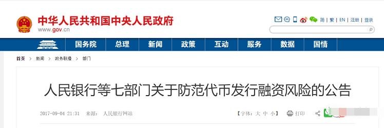 2017年9月4日发布的《中国人民银行 中央网信办工业和信息化部 工商总局 银监会 证监会保监会关于防范代币发行融资风险的公告》