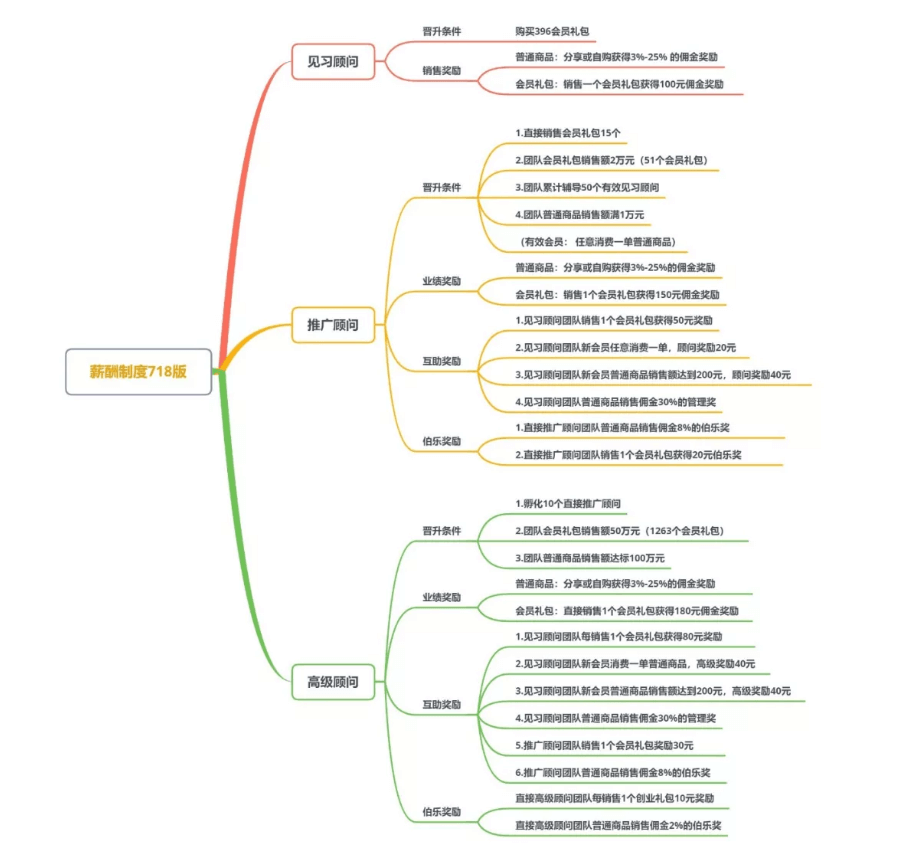 除了VIP只有业绩奖,后两个级别有业绩奖、互助奖和伯乐奖三重奖励,由于篇幅原因不做文字赘述,参考以上奖金制度图片。