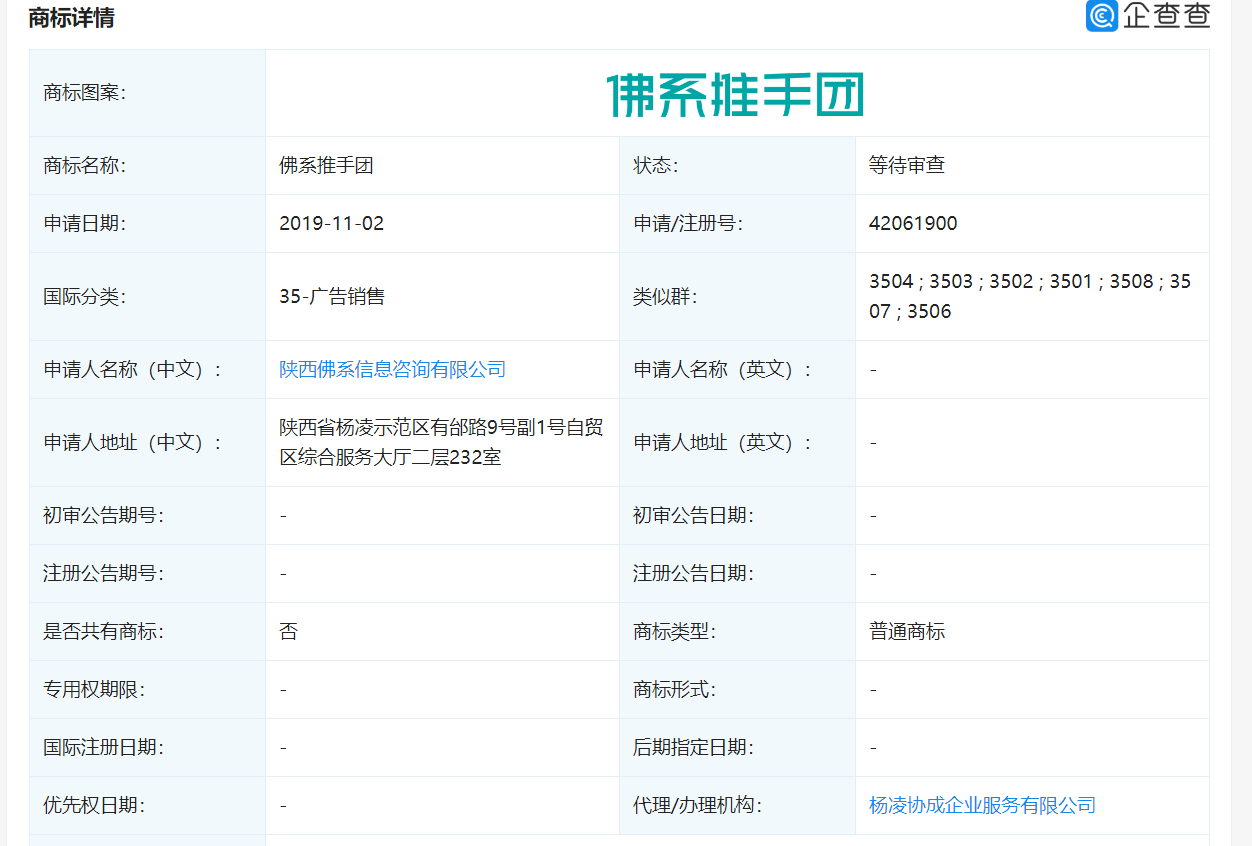 企查查显示,陕西佛系信息咨询有限公司法定代表人是陈化云,工商登记股东有2位,陈化云占股95%,房炜占股5%,其“佛系推手团”商标于2019年11月2日申请,目前仍在审查中。