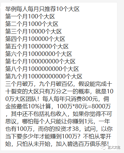 投资38元购买碧选礼包之后便可以发展自己的“事业”,以每人每月推荐个大区为例,每人每年消费800元,按10%佣金算,100*80元=8000万。。。