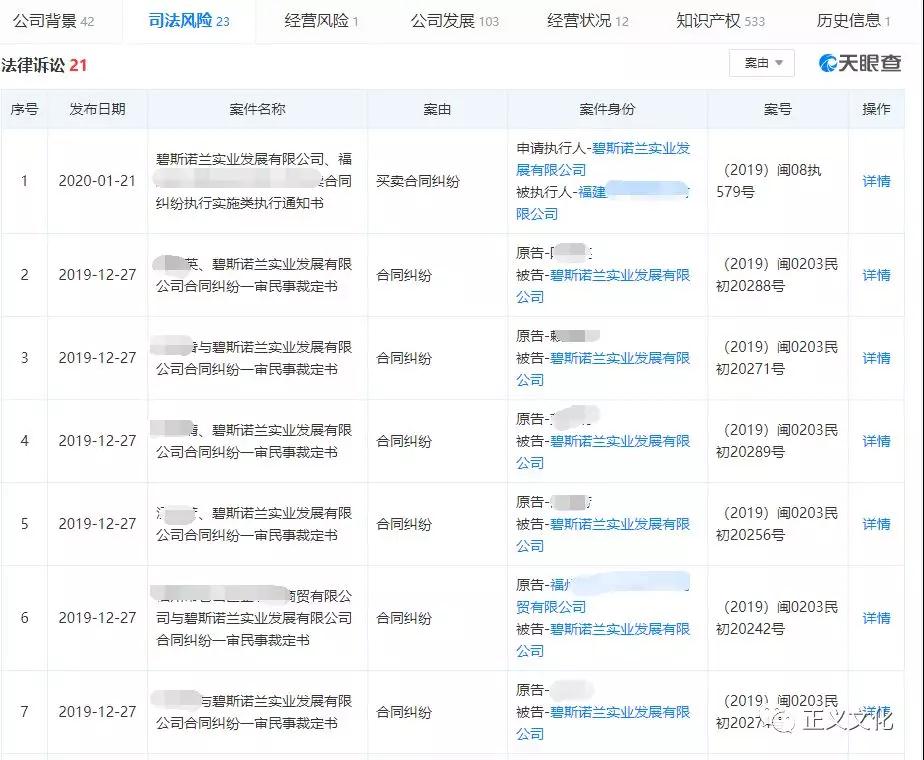 在天眼查中,正义文化查询到了碧斯诺兰涉及到的司法风险共23起,其中大部分都是代理商与碧斯诺兰公司的合同纠纷,我们随意打开一个看看:
