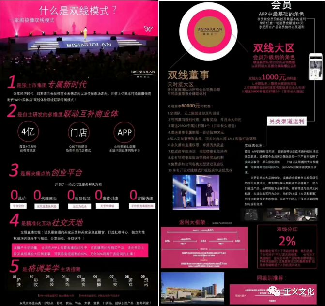 从上图中可以看出,碧斯诺兰双红模式设有董事、大区两个级别,缴纳1000元的加盟费可成为大区,缴纳6万元的加盟费则可以成为董事。碧斯诺兰近年来对外宣称其并未涉嫌传销,因为碧斯诺兰只设有大区和董事两级代理,而传销是三个或三个以上级别才会被认定为传销。