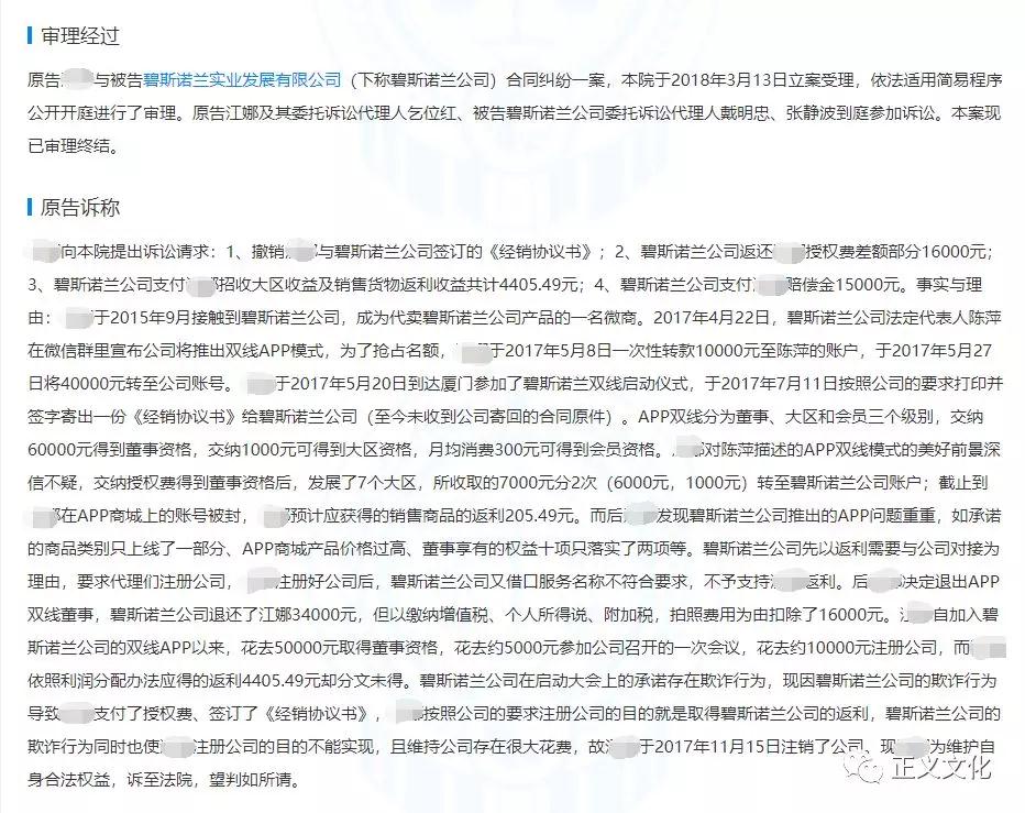 上图案件中的原告是碧斯诺兰双线模式下的一名董事级别的代理,该代理称“碧斯诺兰公司推出的APP问题重重、APP商城产品价格虚高、董事享有的权益十项只落实了两项等”