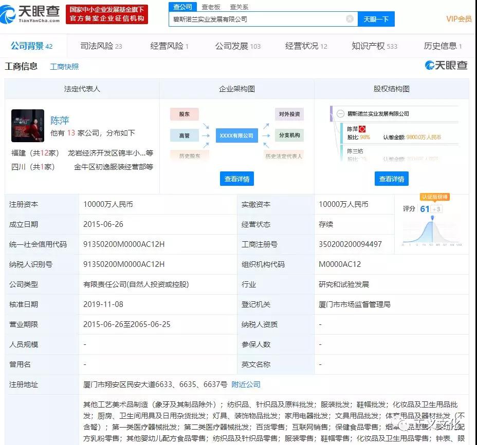 据天眼查显示,碧斯诺兰实业发展有限公司,成立于2015年6月26日,公司注册资本1亿元,法人代表陈萍,1987年出生于福建龙岩。