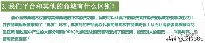 我相信,绝大多数的人都是抱着在平台消费获得公司产品后,还能低折扣从平台拿货继而在商城上代售以此获利的心理,才选择“清心易购”商城。当然“清心易购”商城之前不也是把也把消费的同时还能赚钱作为区分与其他商城的优势特色吗?