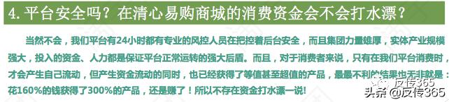 其实这样的结果,会员如果细致去理解之前“清心易购”商城的的宣传资料时就能预测到现在所发生的局面。在“清心易购”商城宣传平台的安全性,消费者投资的钱会不会打水漂时,请看平台是这样解释的:你在平台消费时已经获得了等值甚至超值的产品,最坏的结果也是你花160%的钱获得了300%的产品。是不是说公司在当初就已经做好了这样的准备?只怪平台会员太单纯。