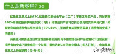 山东阔宇公司对新零售的解释为:就是真正意义上的F2C,就是我们原价去平台(工厂)零售区购买产品,同时获赠140%批发配额和获得批发权(3折),批发后的产品可以自己使用或交由平台代售!所获利润将由消费者与平台共有(90%:10%),把消费变成投资的效果(消费者转变成了消费商)消费者只需要通过日常理性选择真实消费,再不用推销任何产品的情况下也能获利!消费者转变成了消费商的一个过程,最终达到C2F的商业模式(私人订制),也就是真正意义上的物联(无-有-无),也就是消费就是投资赚钱的理念。