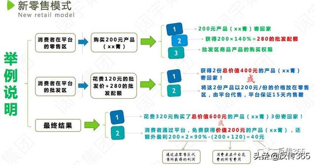 比如,消费者在平台的零售区购买200元的产品后,①将得到价值200元的产品,②还可以获得200✖️140%即280的批发额,③在批发区商品产品的购买权限