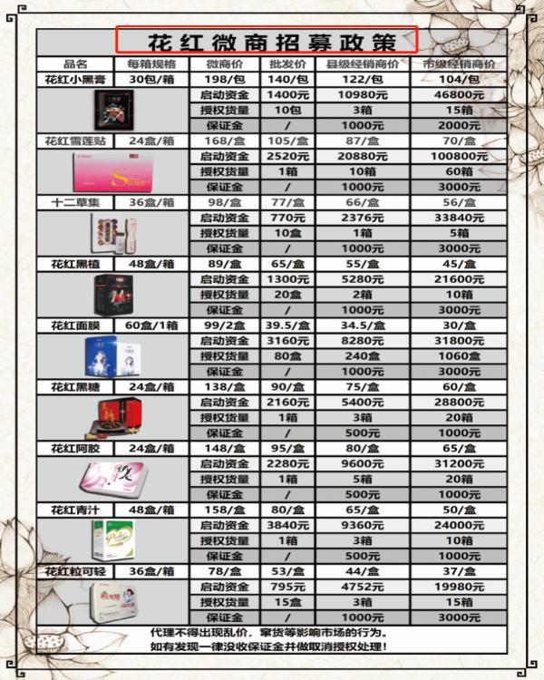 市代购买 " 花红小黑膏 " 单价为 7 元 / 贴,起购数量为 10 包,起始资金为 1400 元,无需保证金;省代购买单价为 6.1 元 / 贴,数量要求为 3 箱,起始资金为 10980 元,保证金为 1000 元;总代购买单价为 5.2 元 / 贴,数量要求为 15 箱,起始资金为 46800 元,保证金为 2000 元;官方购买单价为 4.3 元 / 贴,数量要求为 110 箱,起始资金为 283800 元,保证金为 3000 元;董事购买单价为 3.7 元 / 贴,数量要求为 400 箱,起始资金为 888000 元,保证金为 10000 元。