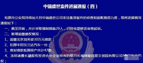 11月27日,松原市公安局第四次发布公告,通报中瑞盛世公司案件的进展。该通报称,截至目前,共计采取强制措施26人,其中已经移送审查起诉15人。
