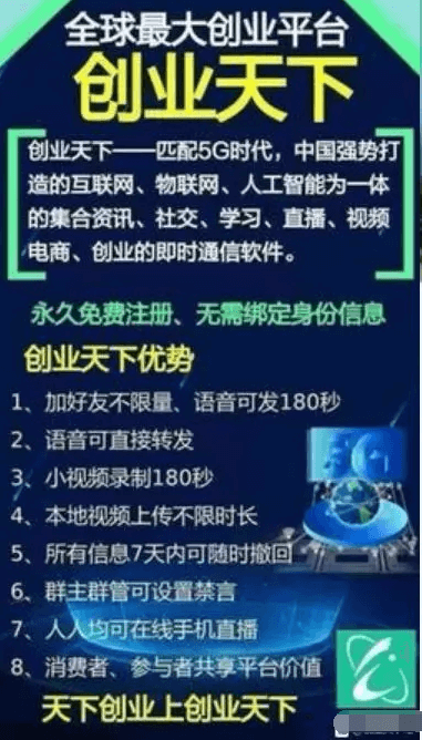 据公开宣传资料显示,创业天下是人联网,物联网,互联网三网合一,是5G技术,大数据,人工智能于一体的综合性新零售应用APP,是集聊天、社交、购物、学习、直播、教育、生活、创业等于一体的综合性的全球创业平台。