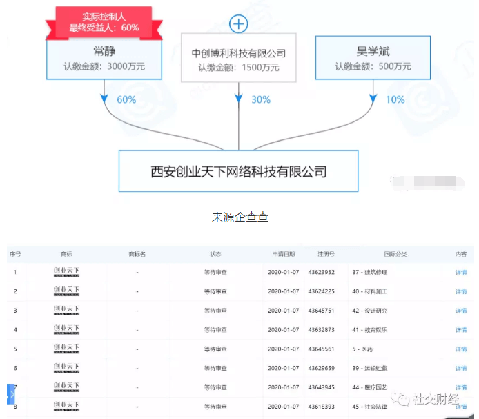 而这家打着5G创业的消费返利平台是由西安创业天下网络科技有限公司(以下简称:西安创业天下公司)运营,公司成立于2017年5月2日,据企查查显示,西安创业天下公司法人是吴学斌,大股东、实际控制人与最终受益者是常静,二股东是中创博利科技有限公司,其“创业天下”商标显示“等待审查”。
