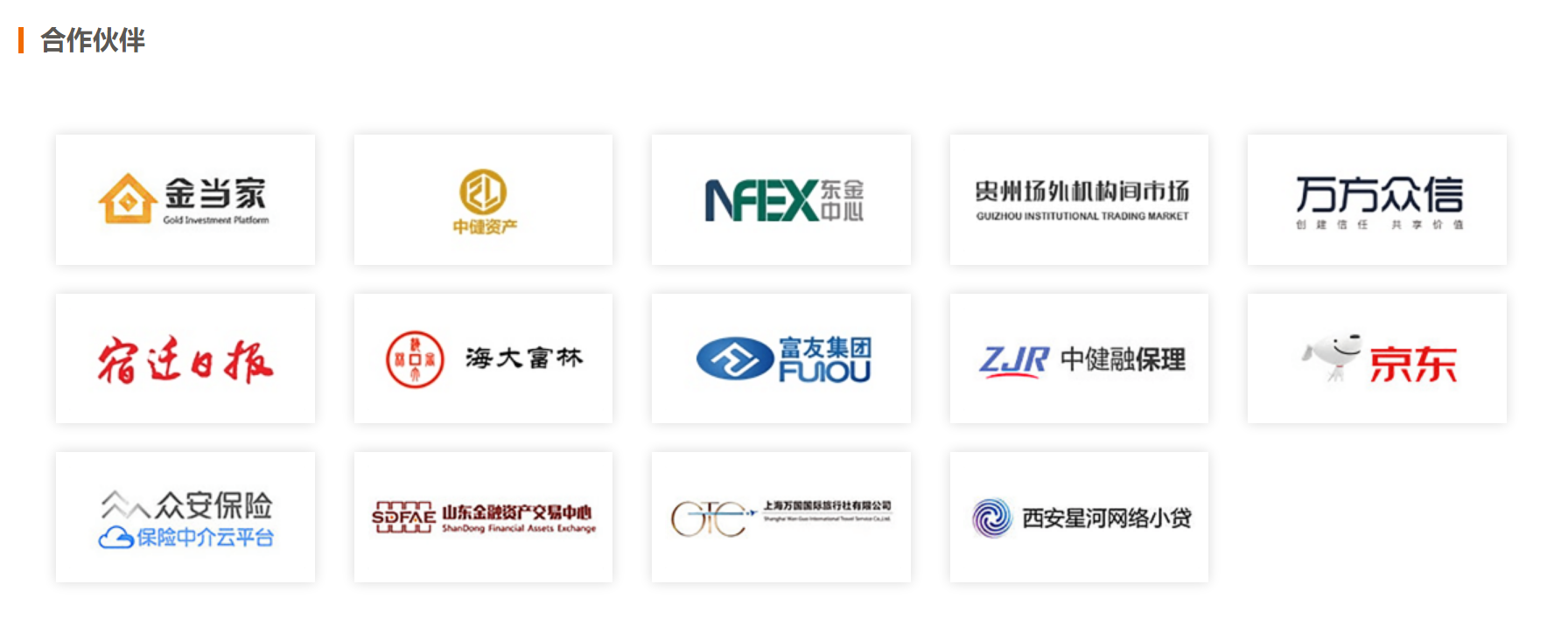 据天合国富公司官网“中经国富”显示,公司合作伙伴包括金当家、中健资产、东金中心、贵州场外机构间市场、万方众信、海大富林、富友集团、中健融保理、京东、众安保险、山东金融资产交易中心、西安星河网络小贷等机构。